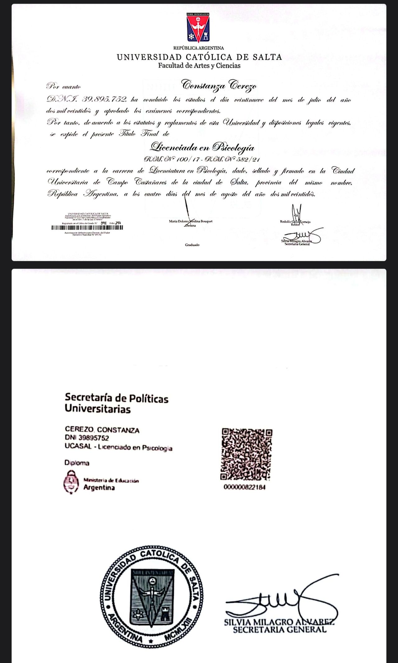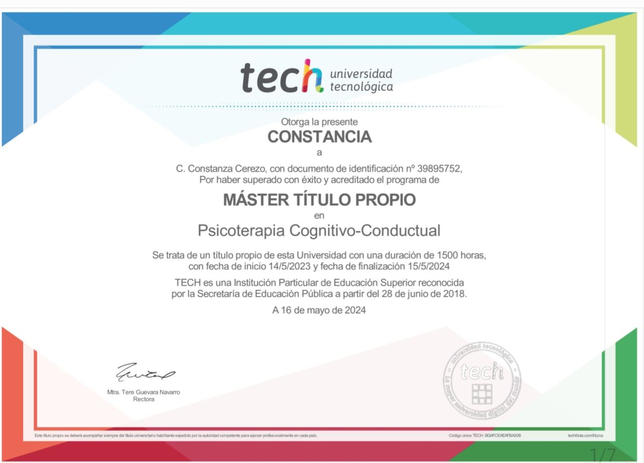 Soy licenciada en psicología, Magister en Terapias Cognitivo Conductual y Magíster en Neuropsicología Clínica.