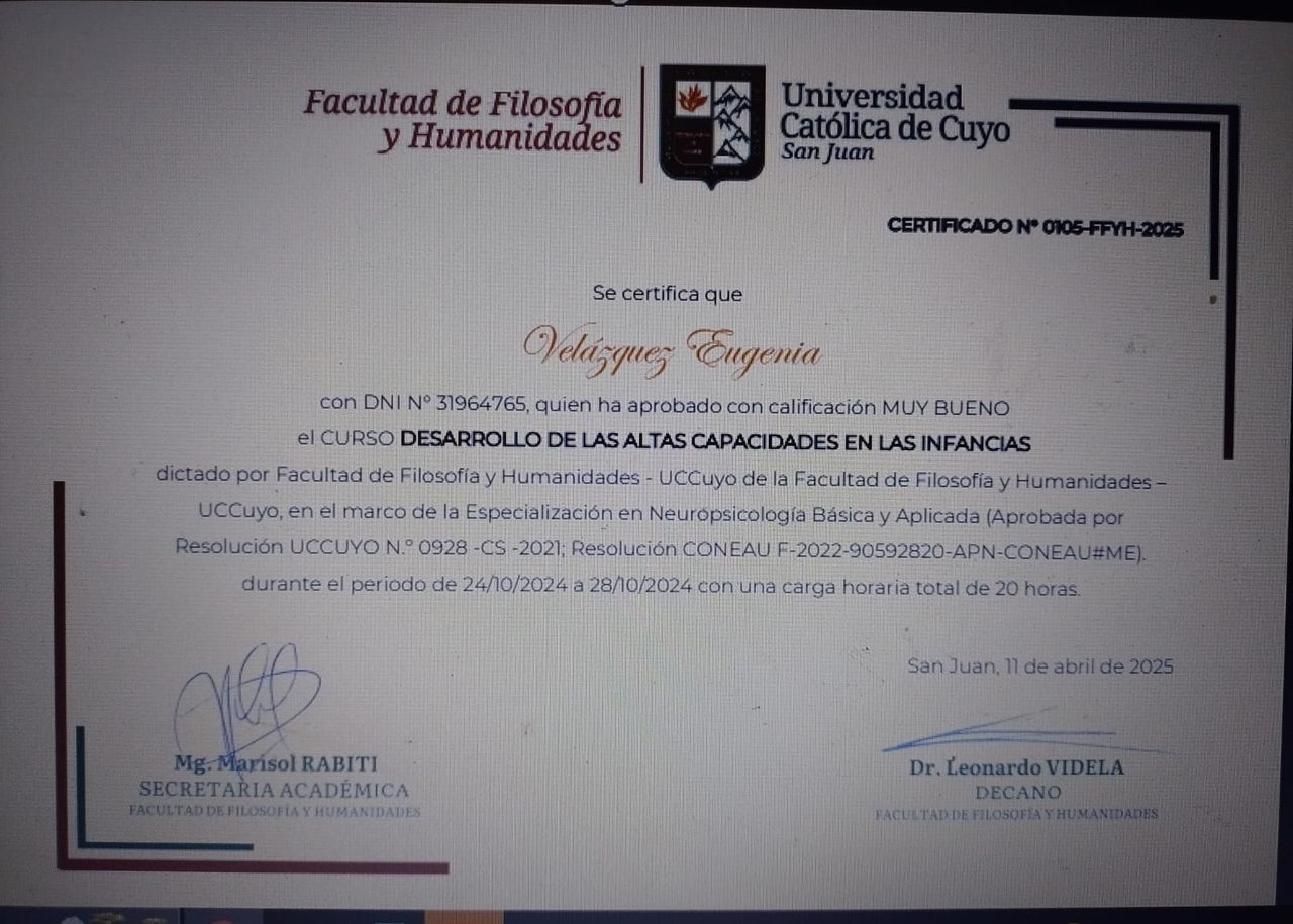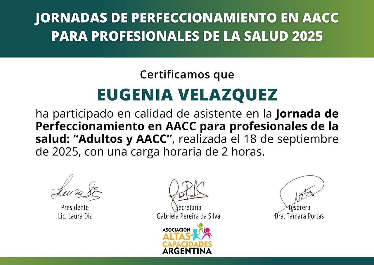 Estimado/a consultante: Mi nombre es Eugenia. Soy Lic en Psicología graduada de la Universidad de Buenos Aires (MN: 54343 / MP: 84583). Cuento con 14 años de ejercicio de la profesión. Completé mi formación académica realizando un posgrado en la misma casa de estudios donde obtuve el título de Especialista en Psicología Clínica con Orientación Psicoanalítica. Luego de eso realicé una Diplomatura en Altas Capacidades Intelectuales; en la actualidad me encuentro realizando un posgrado dictado por la Universidad Nacional de Córdoba que aborda esta temática y formando parte de REPAC, una red de nacional e internacional de formación para profesionales de la salud en Altas Capacidades. Mis últimos años de ejercicio de la profesión se han encaminado en el acompañamiento a estos pacientes.