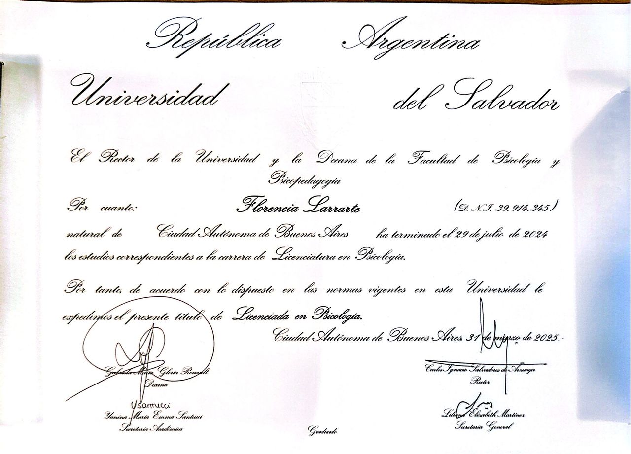 Soy Licenciada en Psicología, con matrícula habilitante en CABA. Me especializo en el acompañamiento de adolescentes y adultos que atraviesan situaciones de ansiedad, estrés, dificultades emocionales y procesos de cambio personal.