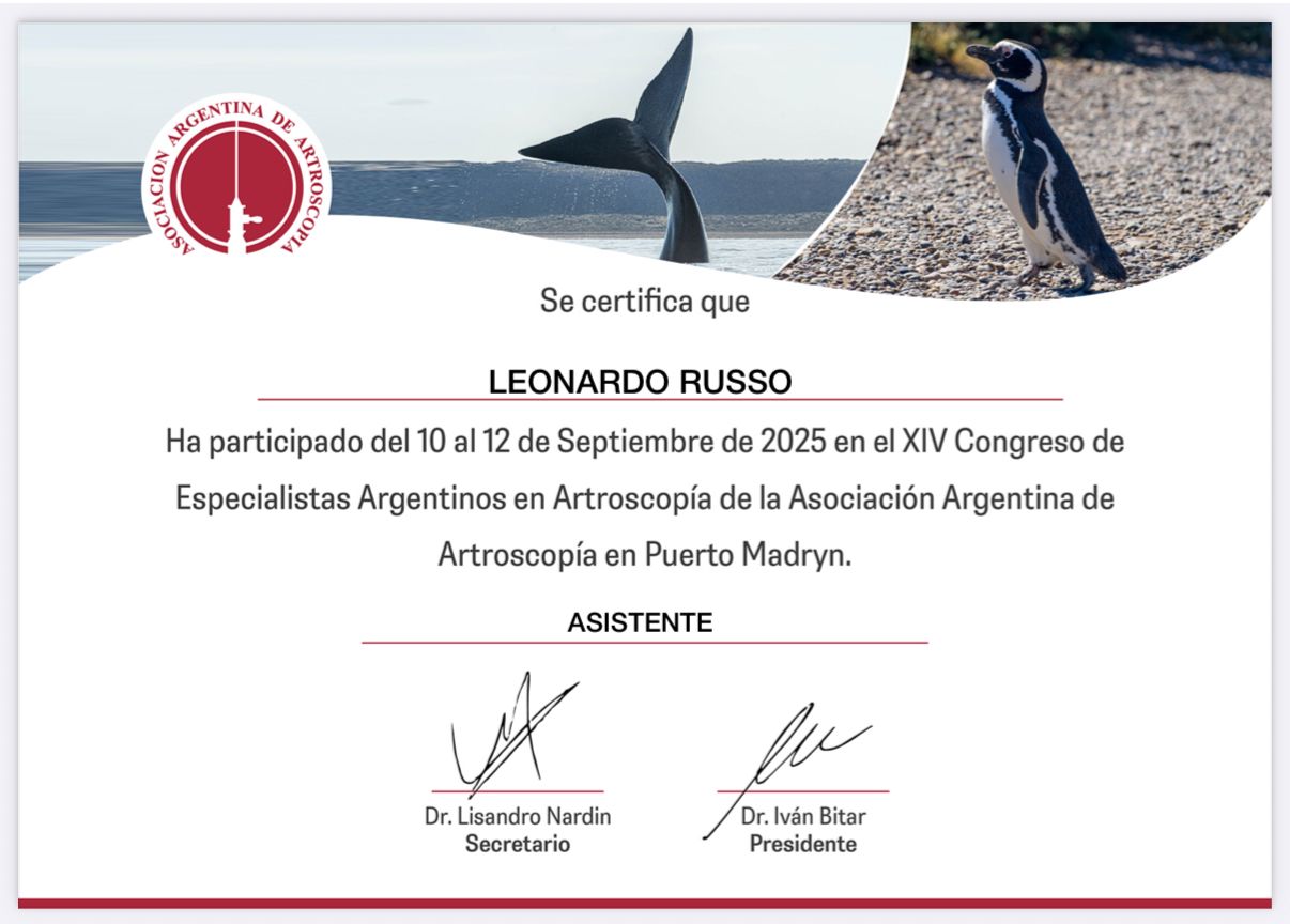 Continuó su especialización realizando fellowships, cursos y rotaciones en cirugía artroscópica de rodilla y hombro en Buenos Aires, Barcelona, Naples (USA) y Santiago de Chile.