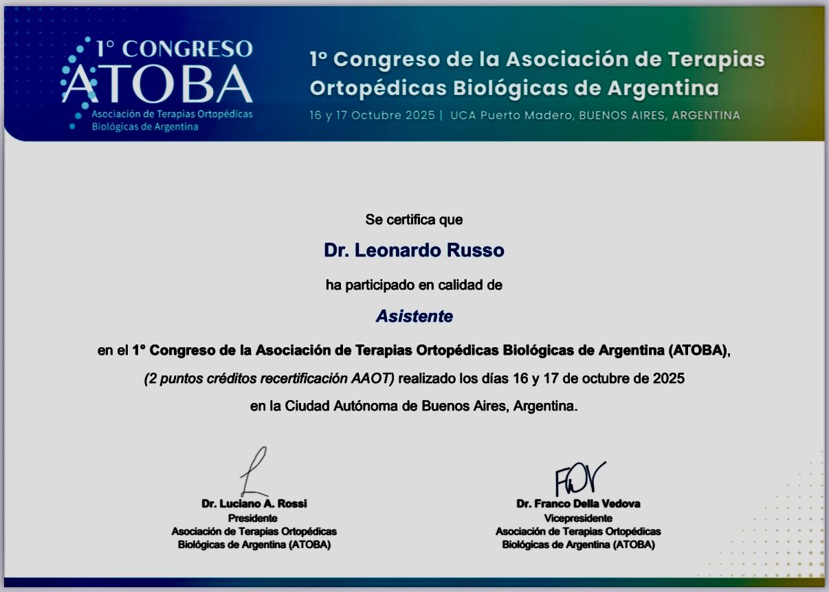 Actualmente sigue día a día con su capacitación en la especialidad siendo miembro de las mas prestigiosas sociedades científicas como la Asociación Argentina de Ortopedia y Traumatología y la Asociación Argentina de Artroscopia.