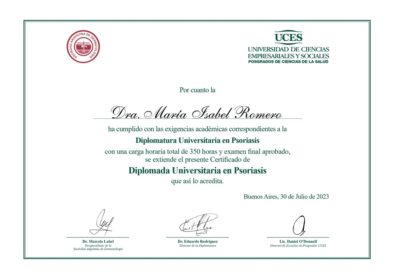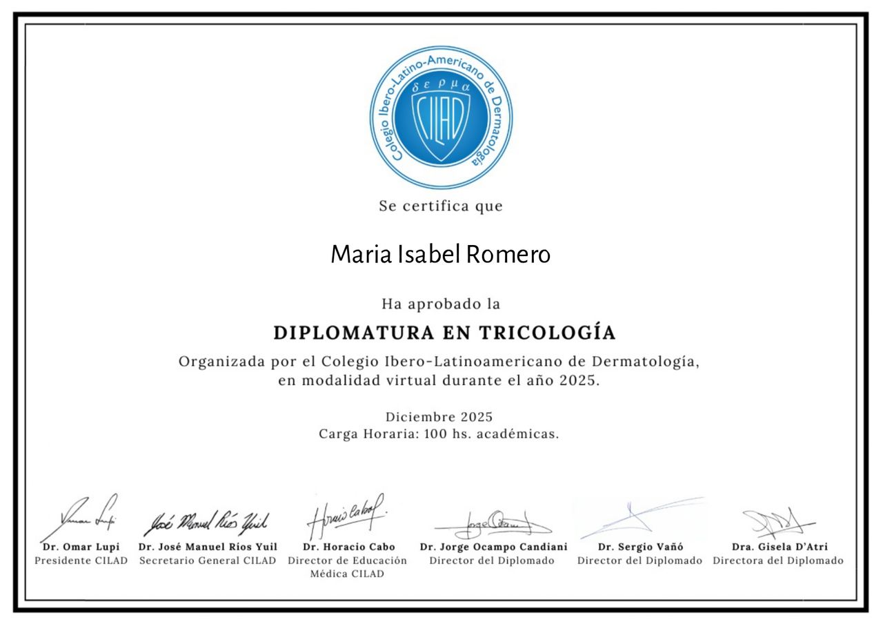 Soy medica clínica y dermatóloga. Me recibí de médica en la UNNE, en la ciudad de Corrientes capital de donde soy. Vine a Bs As a especializarme, iniciando por clínica medica (AMA) y siguiendo por dermatología (UBA). Complete mis estudios haciendo una diplomatura universitaria en clínica estética y reparadora (UAI/AICER), diplomatura en dermatología oncológica (F.BARCELÓ/SAD) y diplomatura universitaria en psoriasis (UCES/SAD). Sigo mi formación con aprendizaje continuo. Atiendo con respeto y empatía, honrando la profesión que elegí y abrazo día a día a pesar de las caídas o tropiezos. Me gratifica ayudar desde el lugar que pueda. No me imagino en la vida haciendo otra cosa