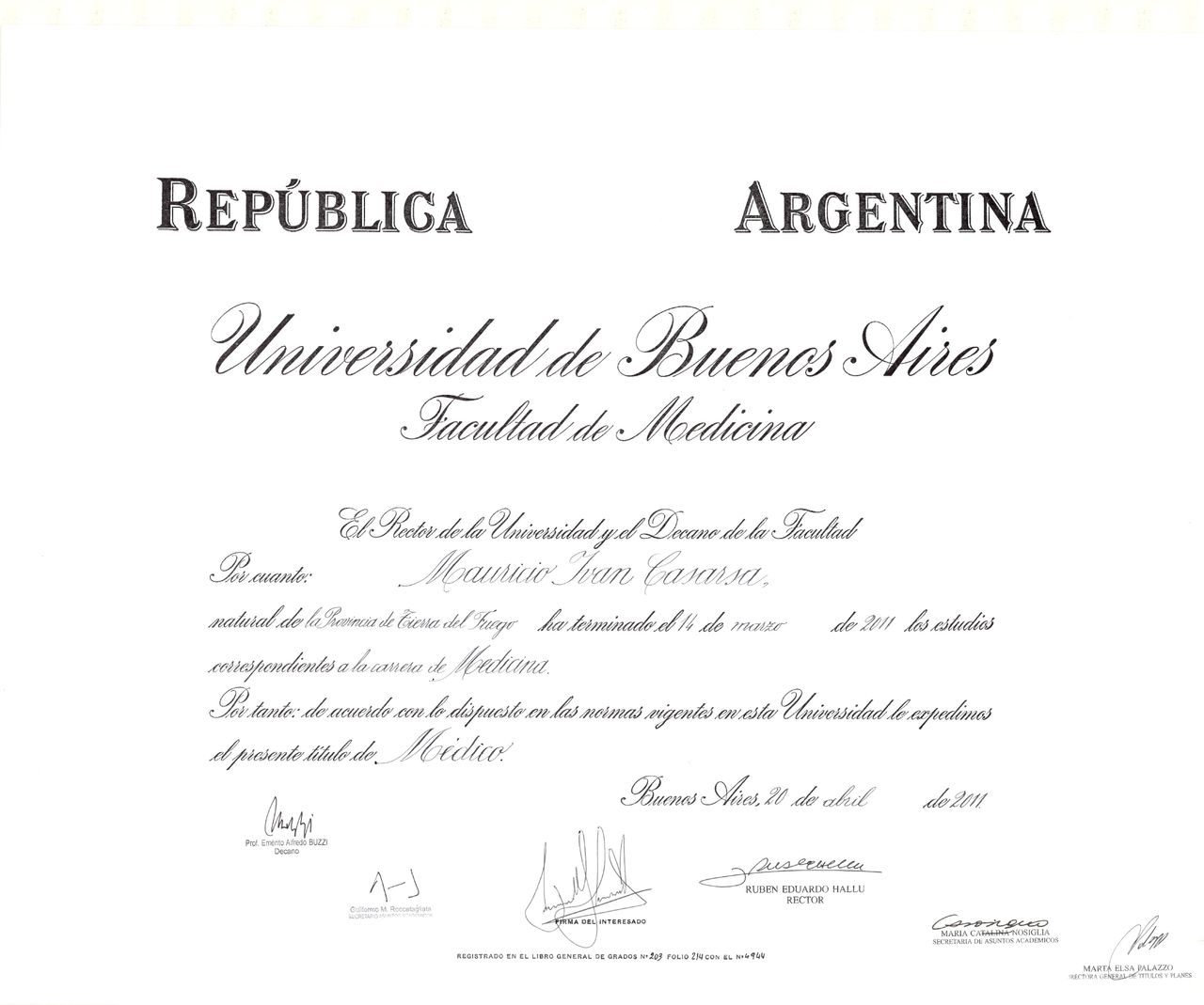- Médico (UBA, Facultad de Medicina, 2011)