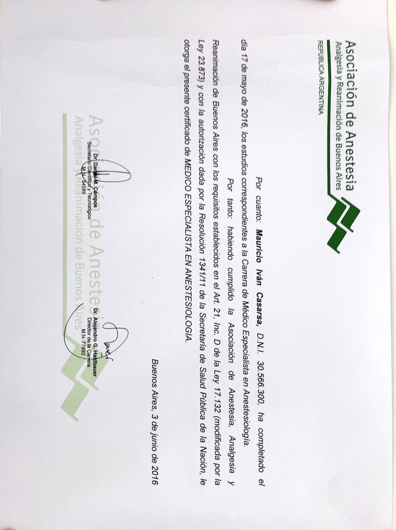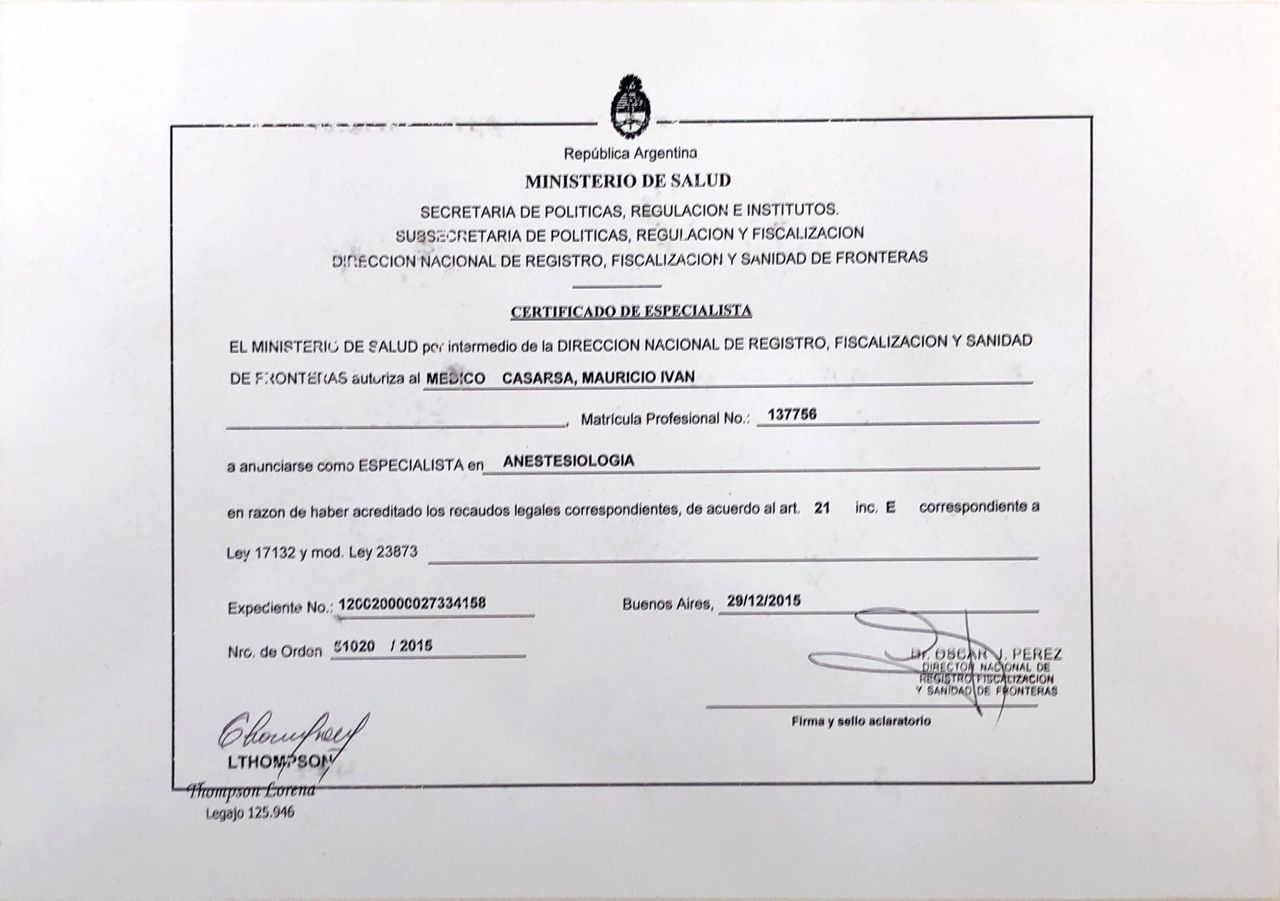 - Especialista en Anestesiología certificado por AAARBA y Ministerio de Salud (MN 137756)