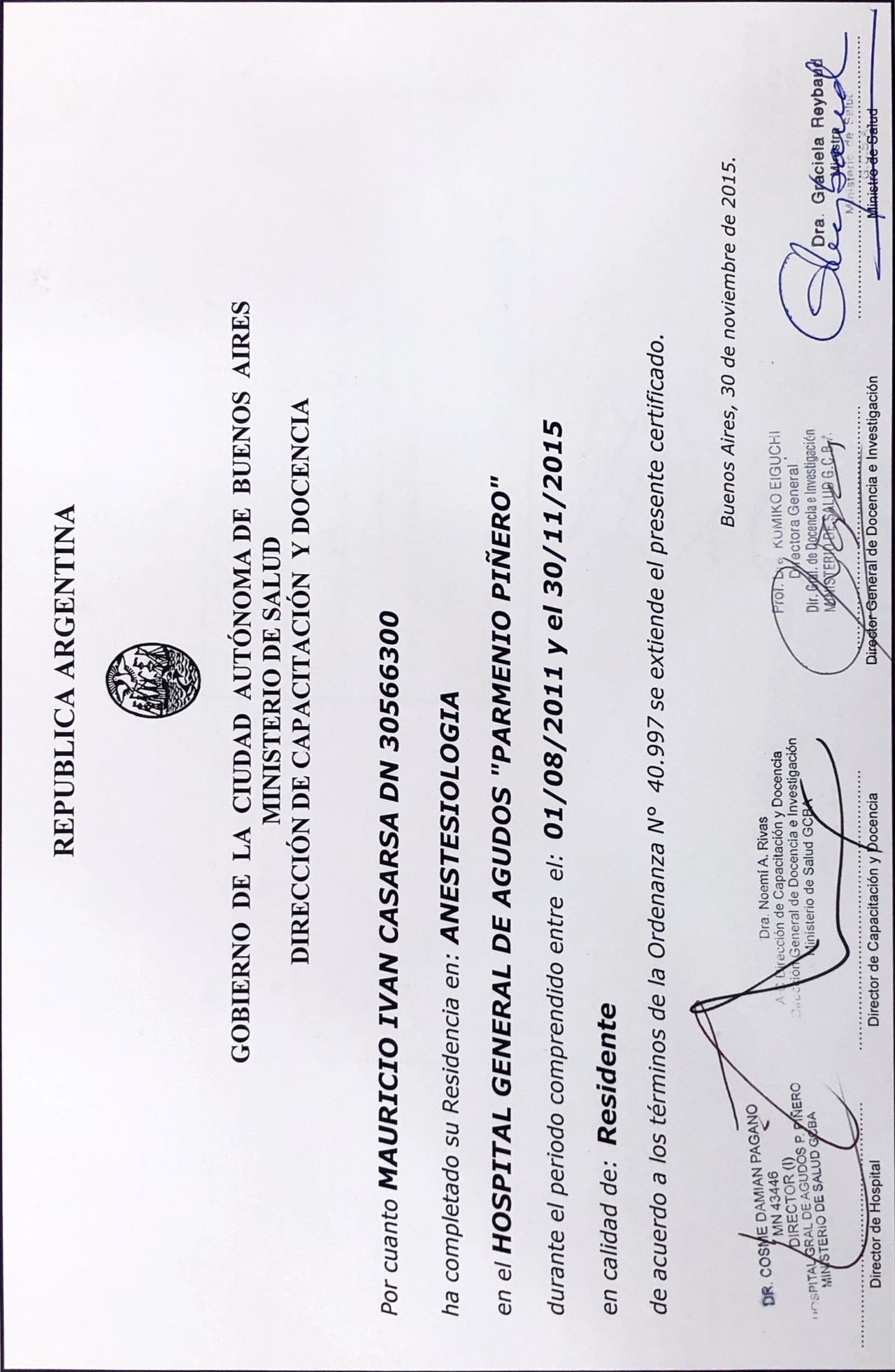- Residencia en Anestesiología, Hospital General de Agudos Parmenio Piñero (2011-2015)