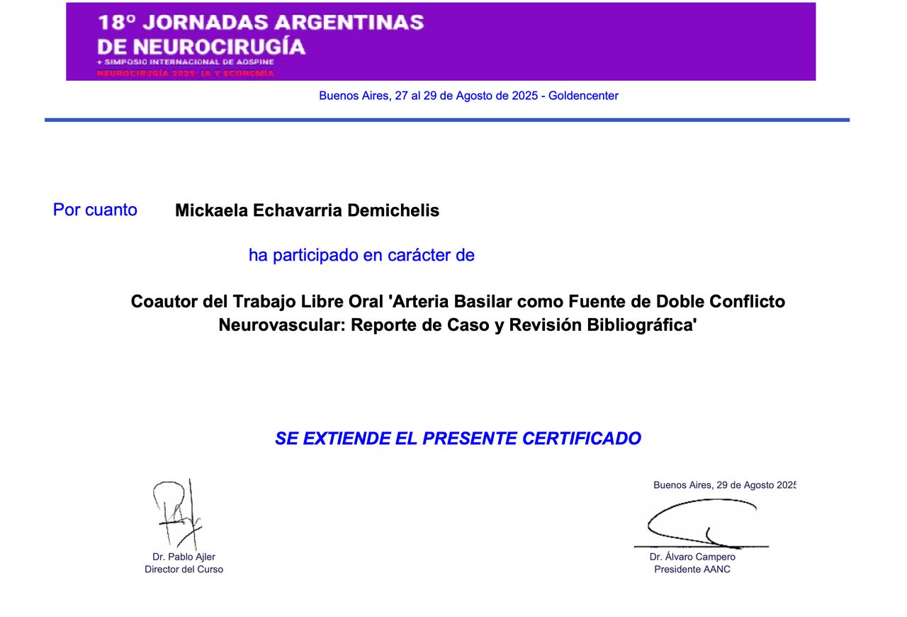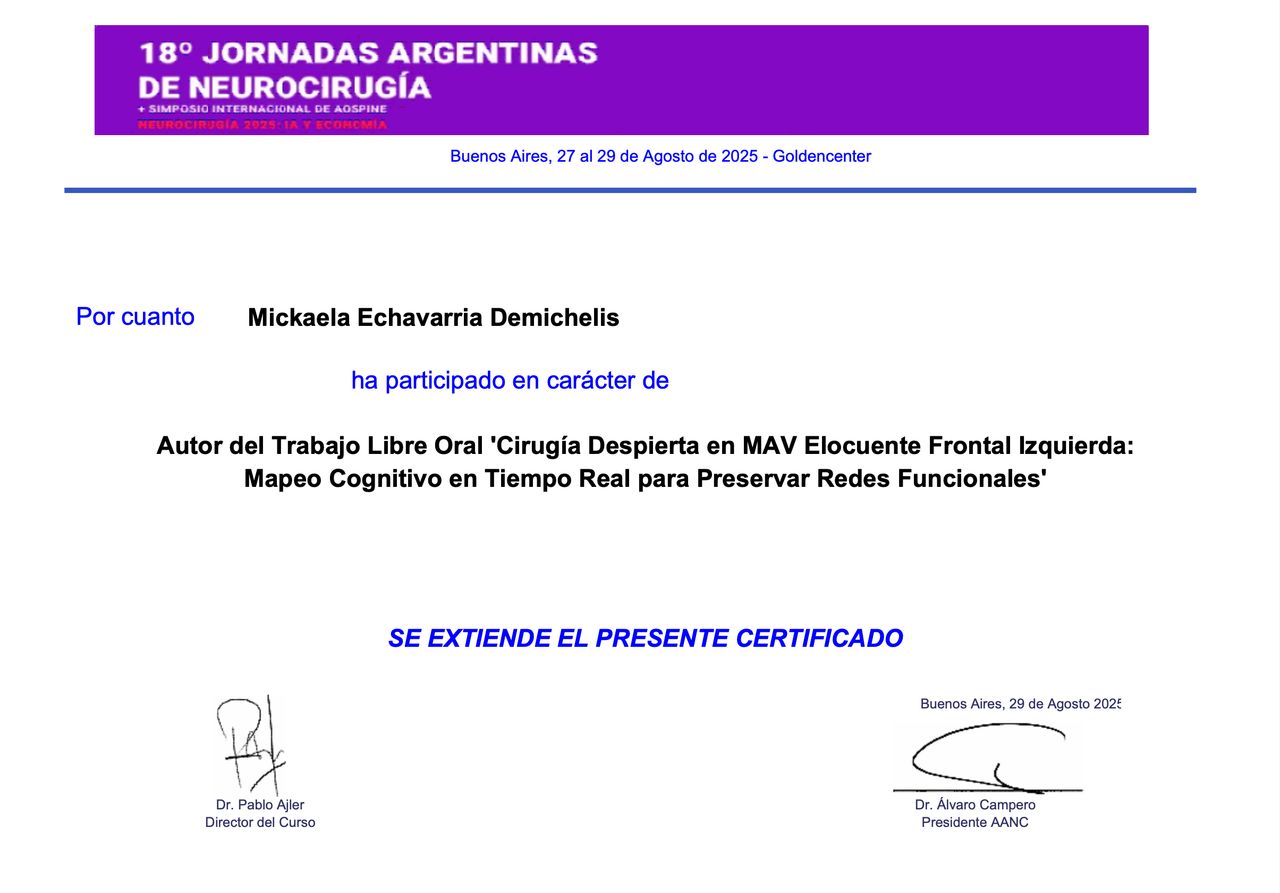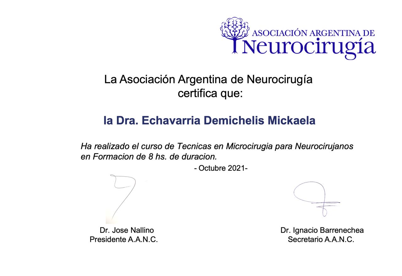 Soy miembro de la Asociación Argentina de Neurocirugía y de la Sociedad Neurológica Argentina, organizaciones que promueven el aprendizaje, la investigación y la colaboración en neurociencias. Mi objetivo es brindar una atención cercana, de alta calidad y basada en la mejor evidencia científica, acompañando a cada persona con respeto y dedicación en cada paso del tratamiento.