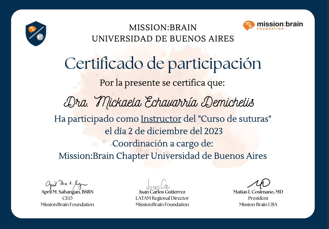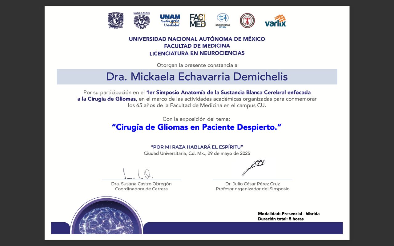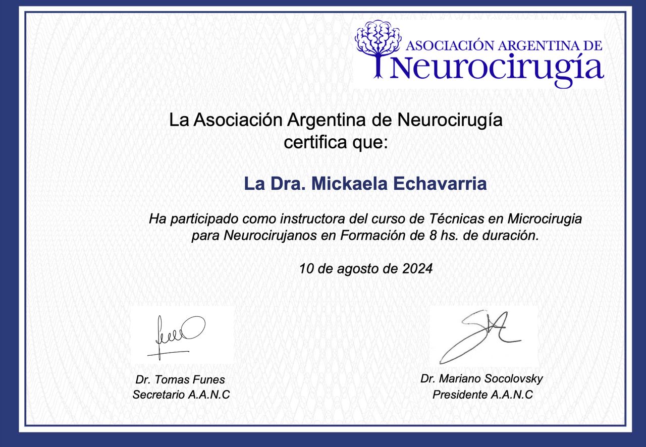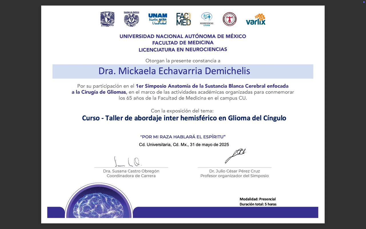 Estoy convencida de que la excelencia médica se construye día a día, por eso participo activamente en proyectos de formación continua, entrenamientos en microcirugía, y cursos sobre disección de fibras cerebrales. Además, me involucro con la comunidad académica como docente e instructora en cursos especializados, comprometiéndome con la docencia, la investigación y la actualización continua.