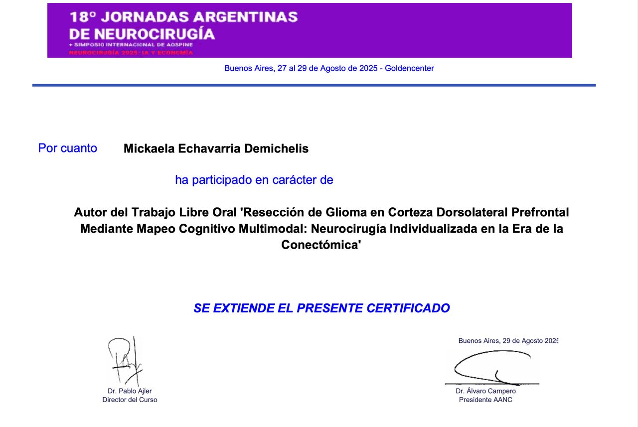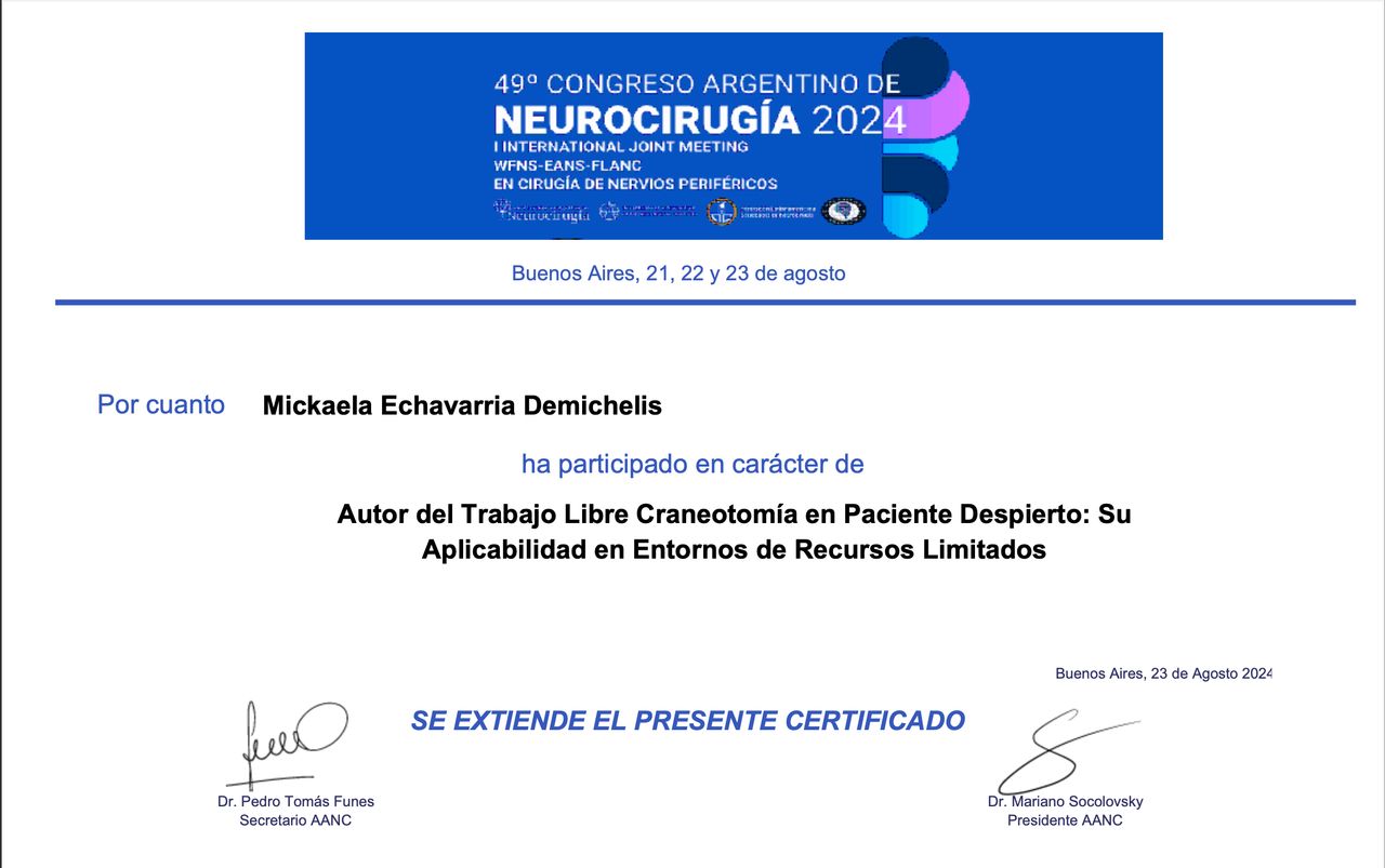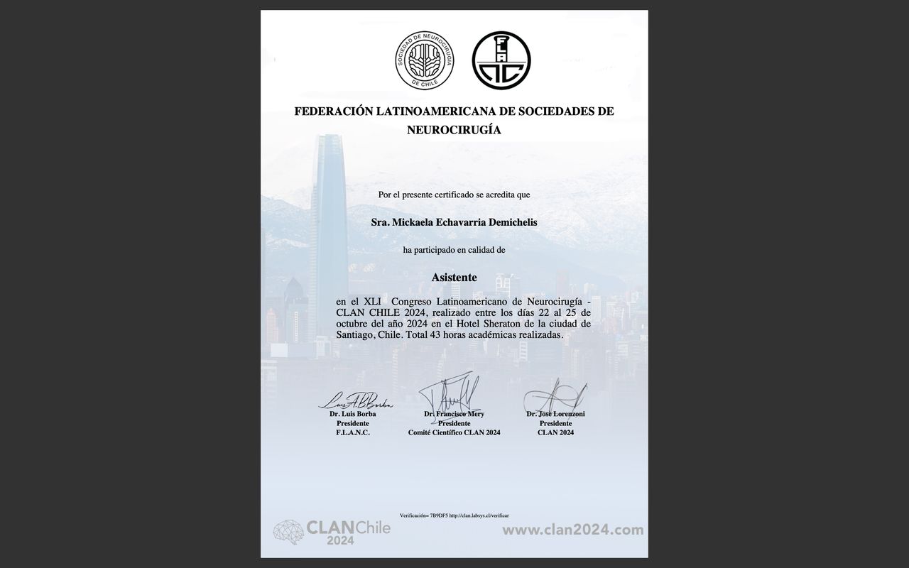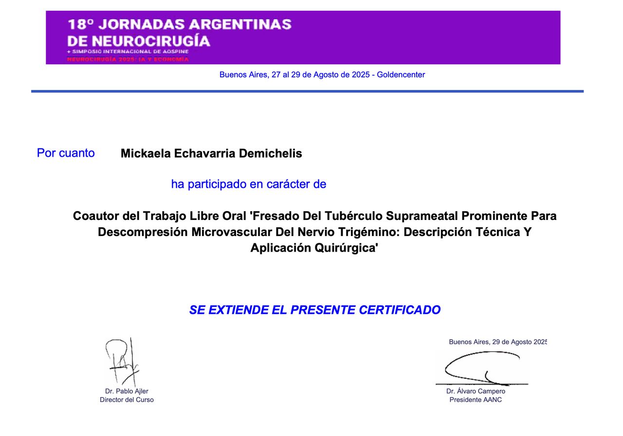 Estoy convencida de que la excelencia médica se construye día a día, por eso participo activamente en proyectos de formación continua, entrenamientos en microcirugía, y cursos sobre disección de fibras cerebrales. Además, me involucro con la comunidad académica como docente e instructora en cursos especializados, comprometiéndome con la docencia, la investigación y la actualización continua.
