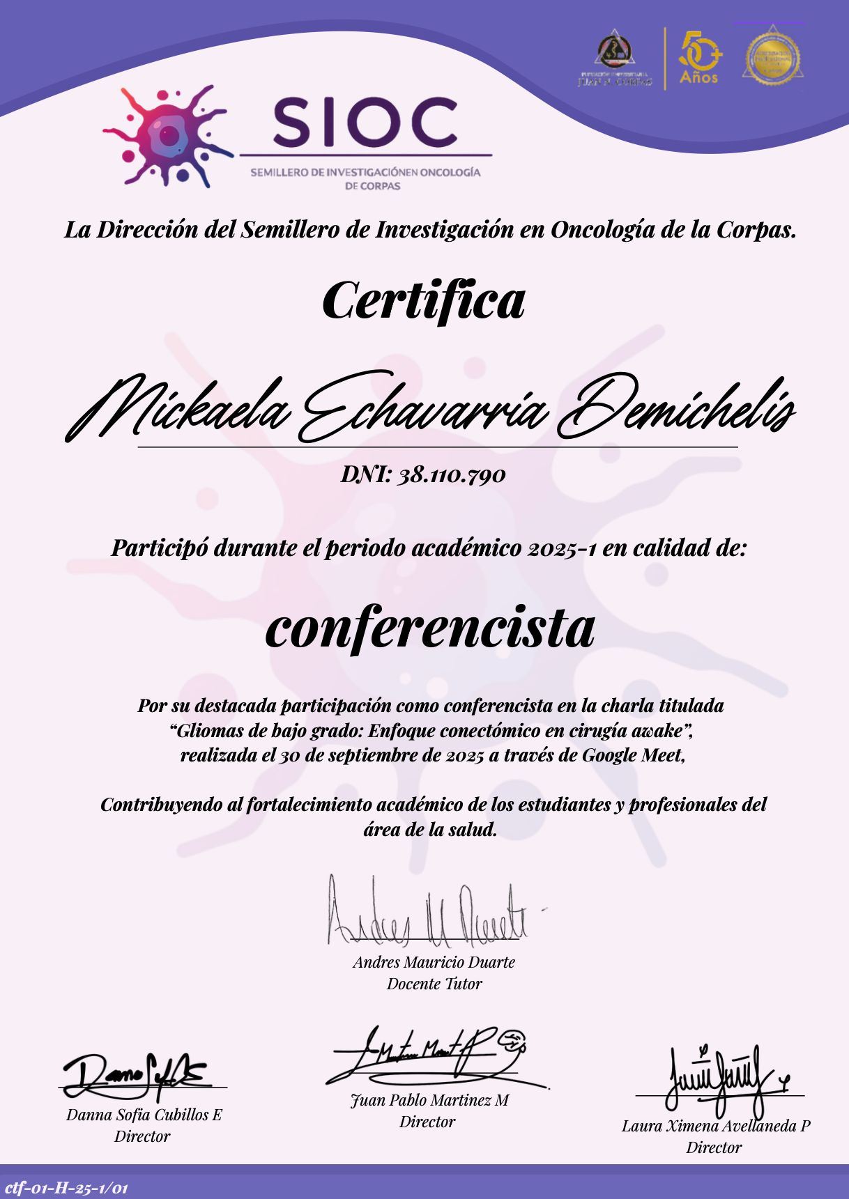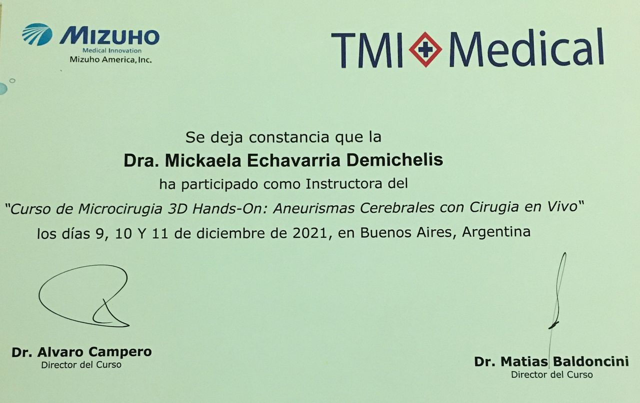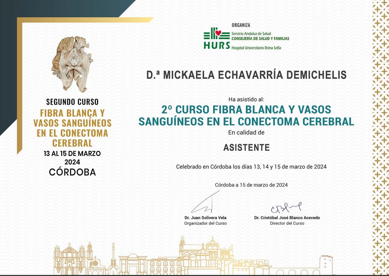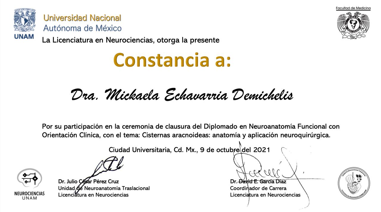 Estoy convencida de que la excelencia médica se construye día a día, por eso participo activamente en proyectos de formación continua, entrenamientos en microcirugía, y cursos sobre disección de fibras cerebrales. Además, me involucro con la comunidad académica como docente e instructora en cursos especializados, comprometiéndome con la docencia, la investigación y la actualización continua.