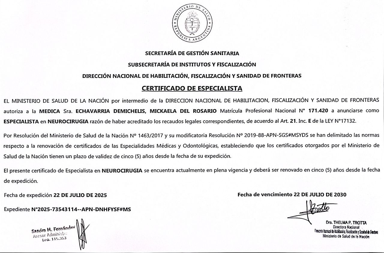 Soy la Dra. Mickaela Echavarría Demichelis, Médica Neurocirujana.