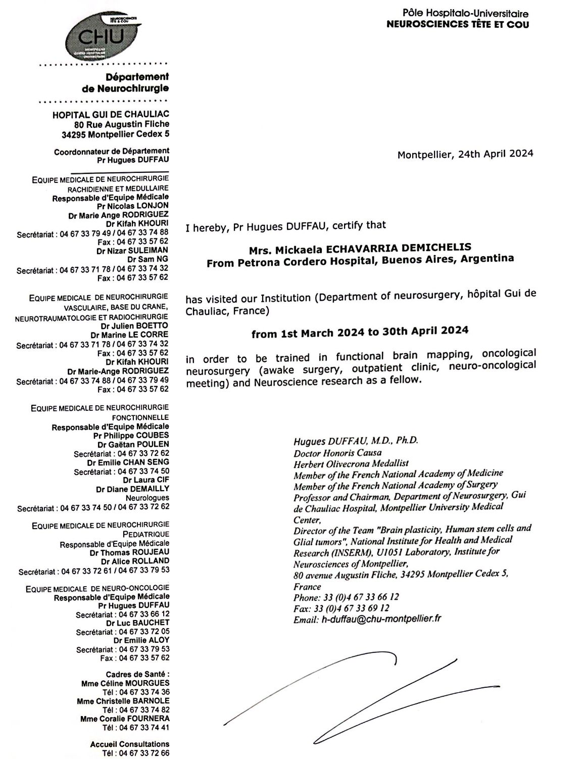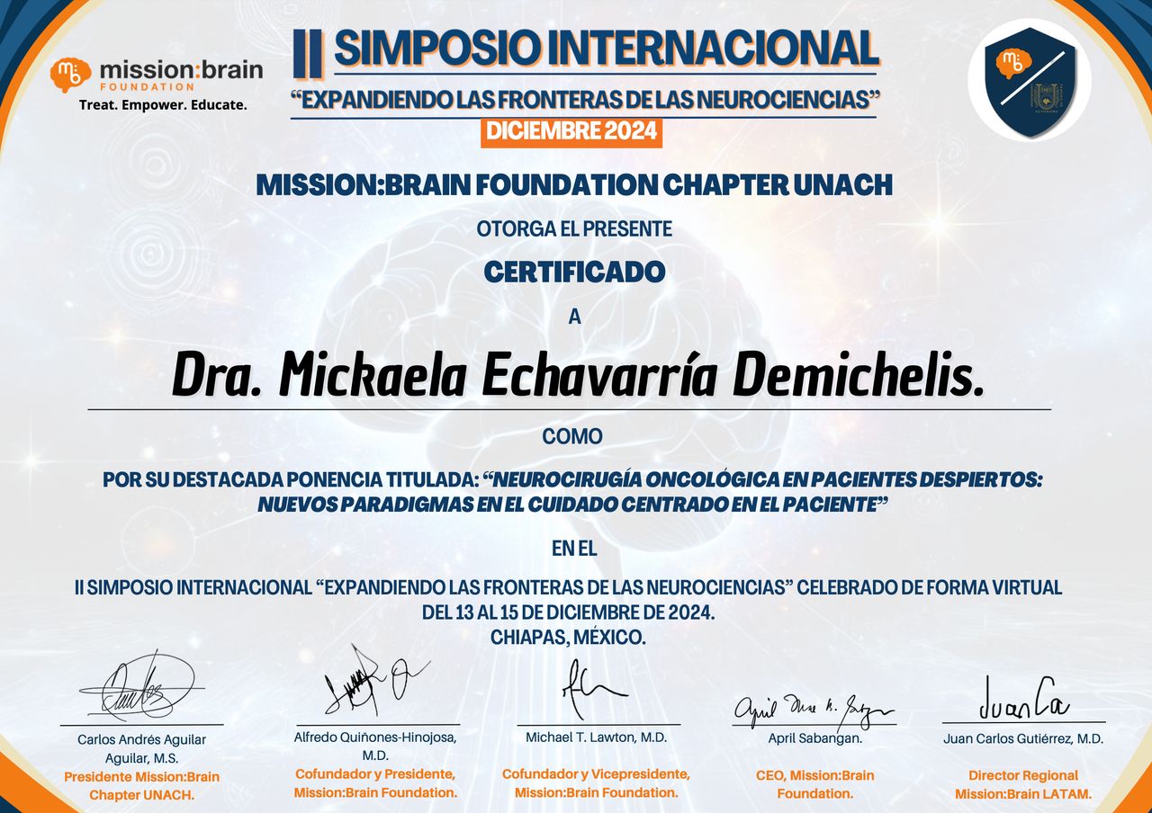 Con el deseo de ofrecer a mis pacientes tratamientos más precisos y respetuosos con sus funciones neurológicas, viajé a Montpellier, Francia, para especializarme en Neurocirugía Oncológica en Pacientes Despiertos. Allí tuve la oportunidad de formarme junto al Prof. Hugues Duffau, un referente mundial en este campo.