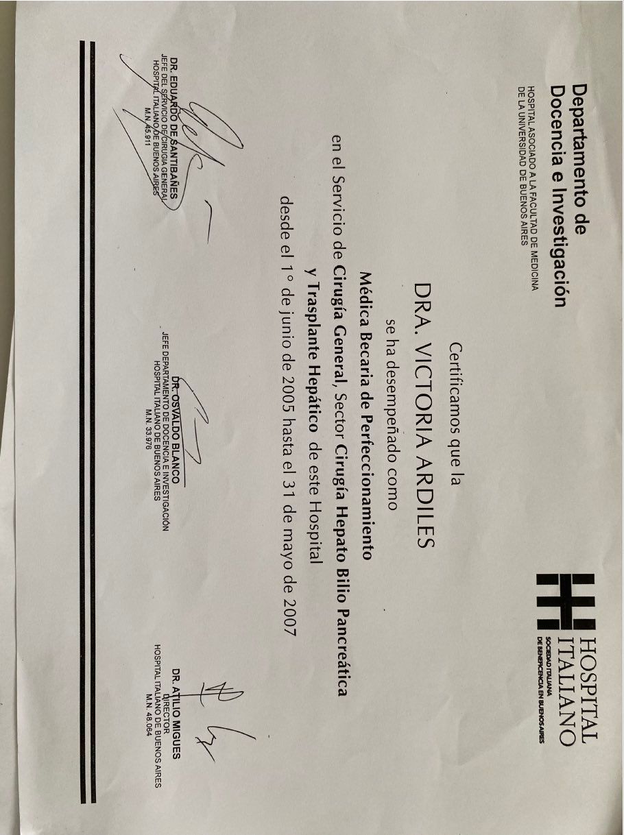 Tuve la suerte de conocer y ser atendido por la Dra. Victoria Ardiles, una profesional increíble con más de 20 años de experiencia en cirugía hepática, pancreática, de la vía biliar y trasplante hepático. Desde el primer momento, su trato cercano, detallado y muy humano me dio una confianza total en su habilidad para enfrentar procedimientos complicados.